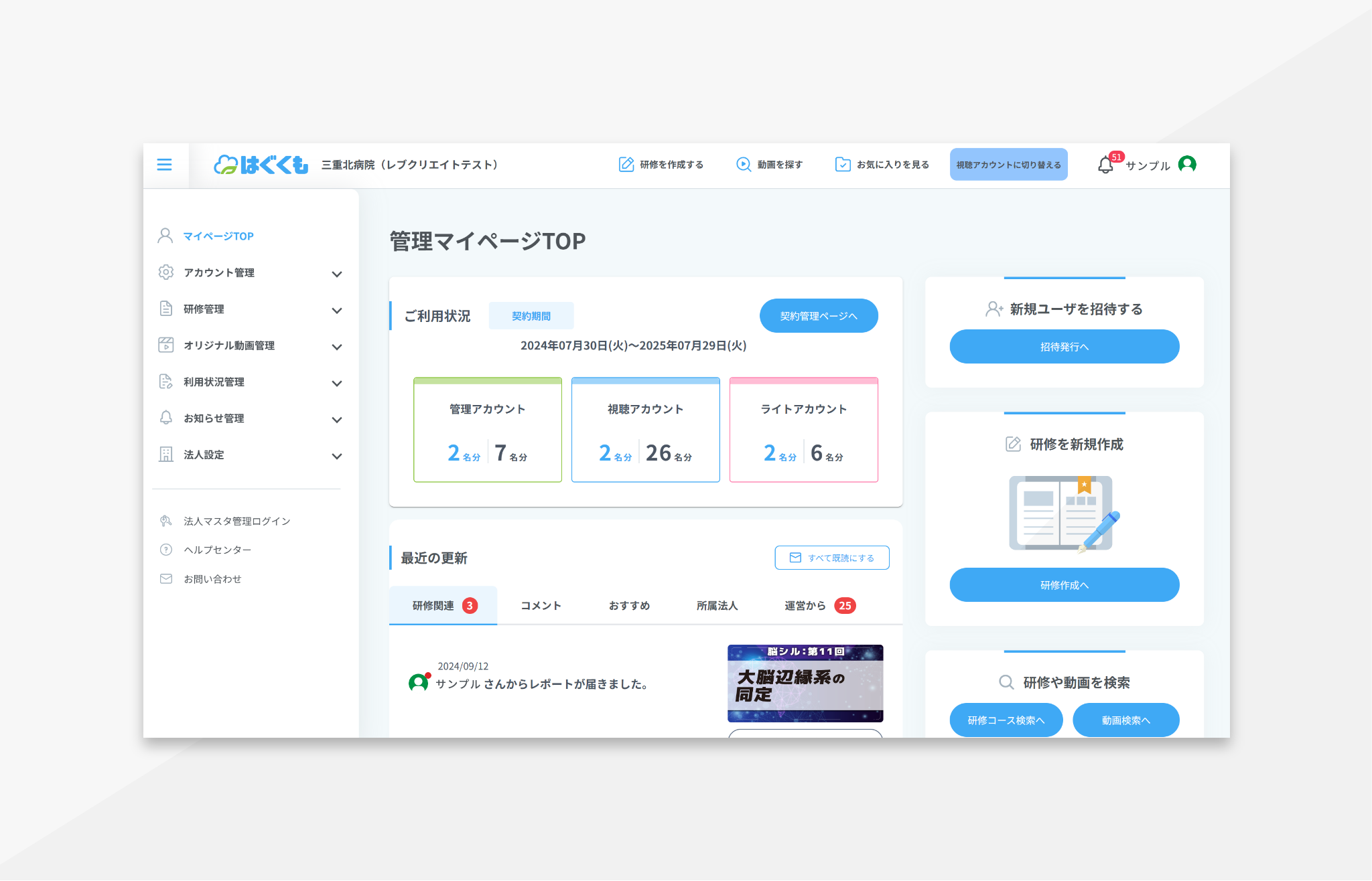医療従事者向け法⼈⽤研修管理システム開発を担当させていただきました。既存で運営されている医療関係者向けの講義‧セミナー動画配信サー