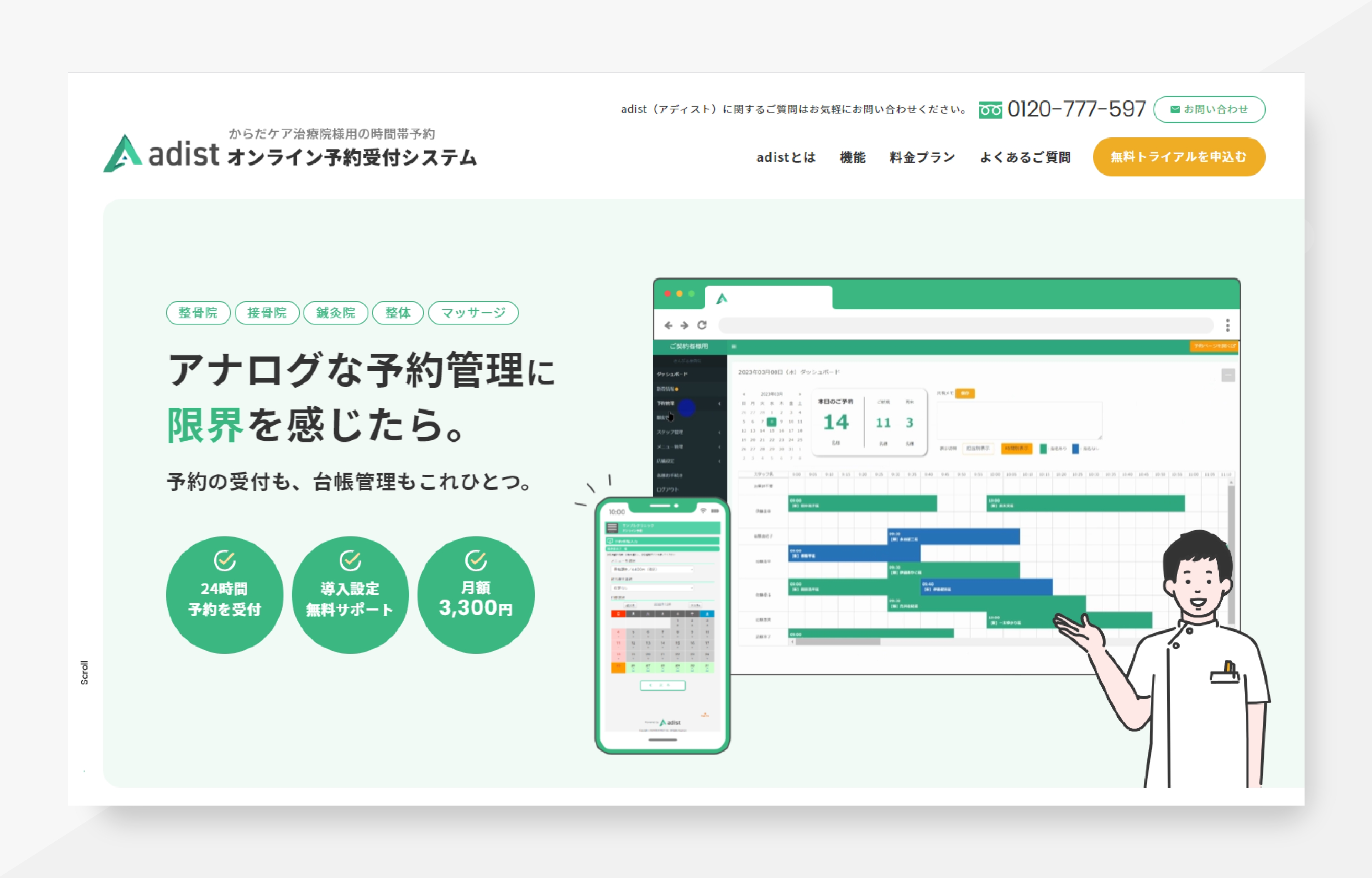 接骨院、整体、鍼灸院などの治療院向けに開発したオンライン予約管理システムです。 予約管理システムはすでに多数のサービスが展開されていますが、高機能・高価格帯なので手が出しずらく、使いこなせないという...